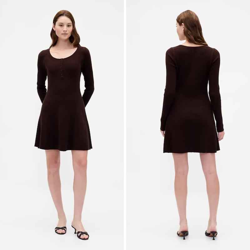 The GAP CashSoft Rib Mini Sweater Dress is basically your favourite fall sweater, Henley, and frock rolled into one. It’s made of a midweight plush yarn that has a cashmere-soft feel (hence the name), and features a scoop neck with a front button placket. It has a simple fit-and-flare silhouette and hits just above the knee, making it perfect for pairing with boots.