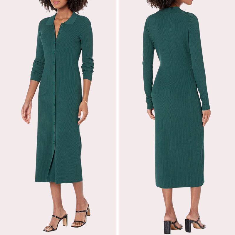 The Jaxon Ribbed Sweater Dress gives you that same midi length, but with a more form-fitting silhouette. It has a spread collar, functional button placket, and can easily be dressed up or down with the right accessories.