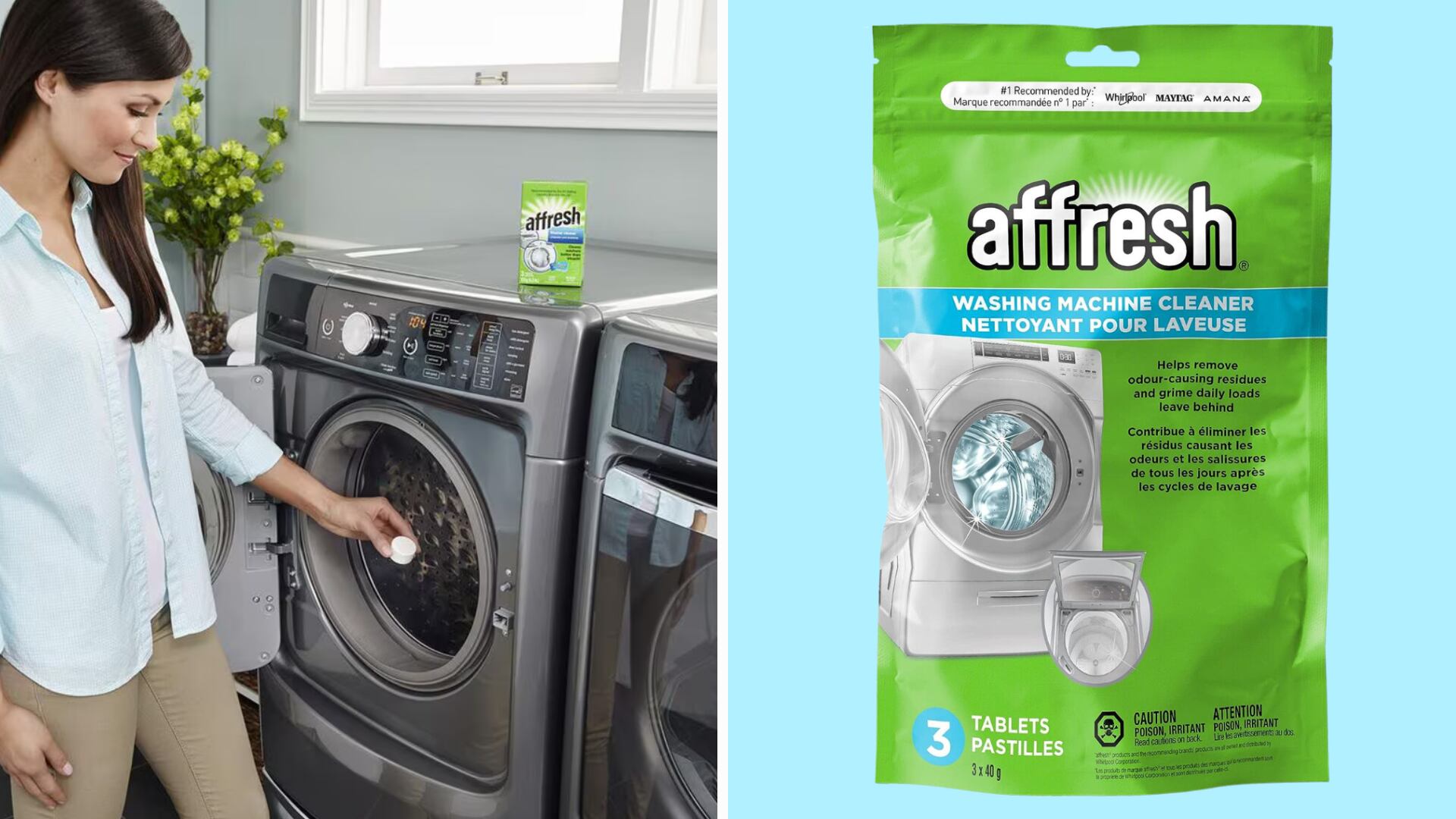 To help you with those maintenance cleans, you’ll need the right supplies. That’s where the Affresh Washing Machine Cleaner Tablets come in handy. They work with both top-load and front-load machines and effectively remove odour-causing residue and built-up grime. And they couldn’t be easier to use. Just pop one in your washer on a regular cycle, and it'll get to work. They’re safe on septic tanks and safe for all washer components, so you won’t have to worry about doing more harm than good.